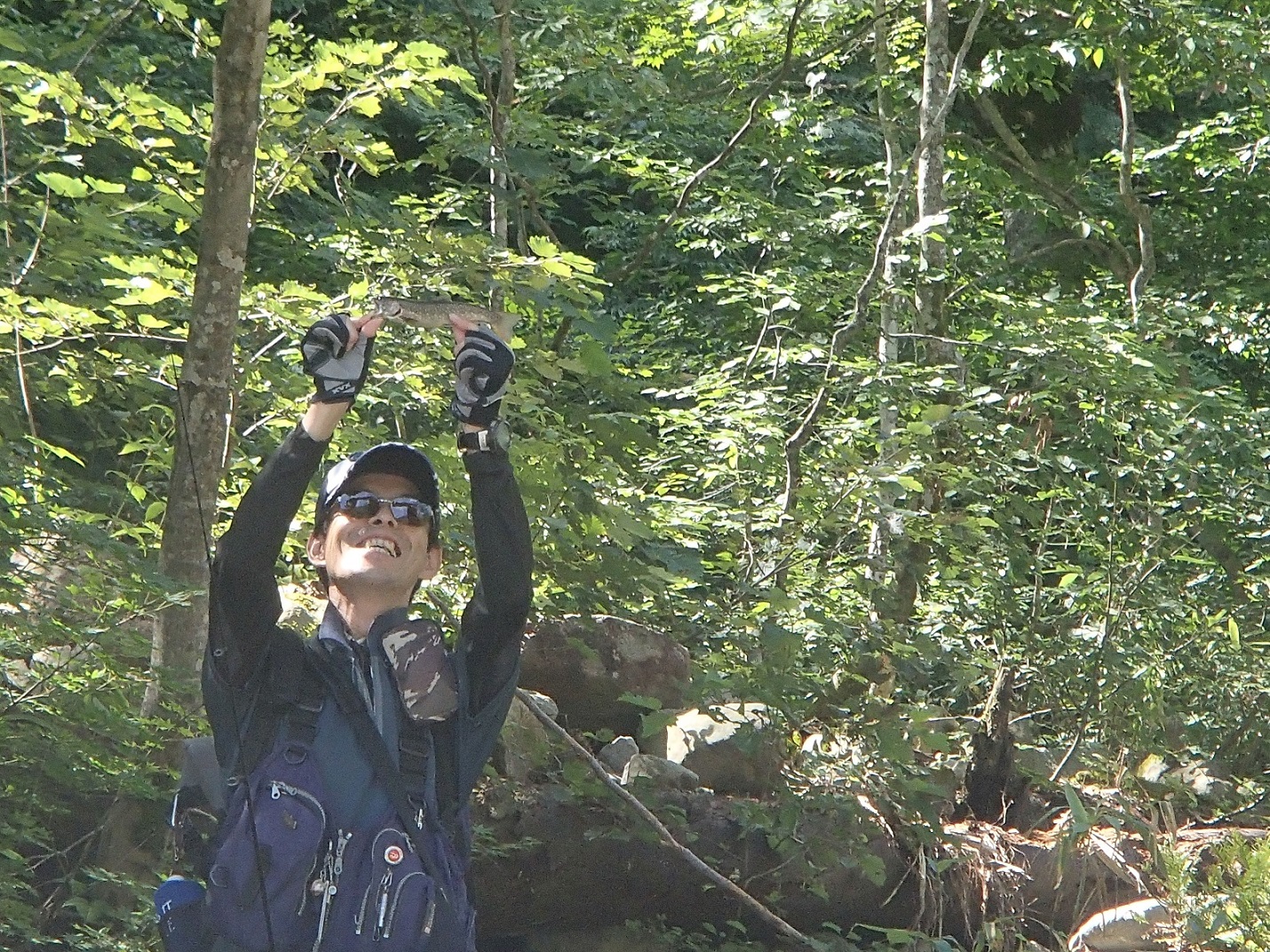 T氏は源流部の入り口で生き餌を使い何とか20センチほどに岩魚をゲット。