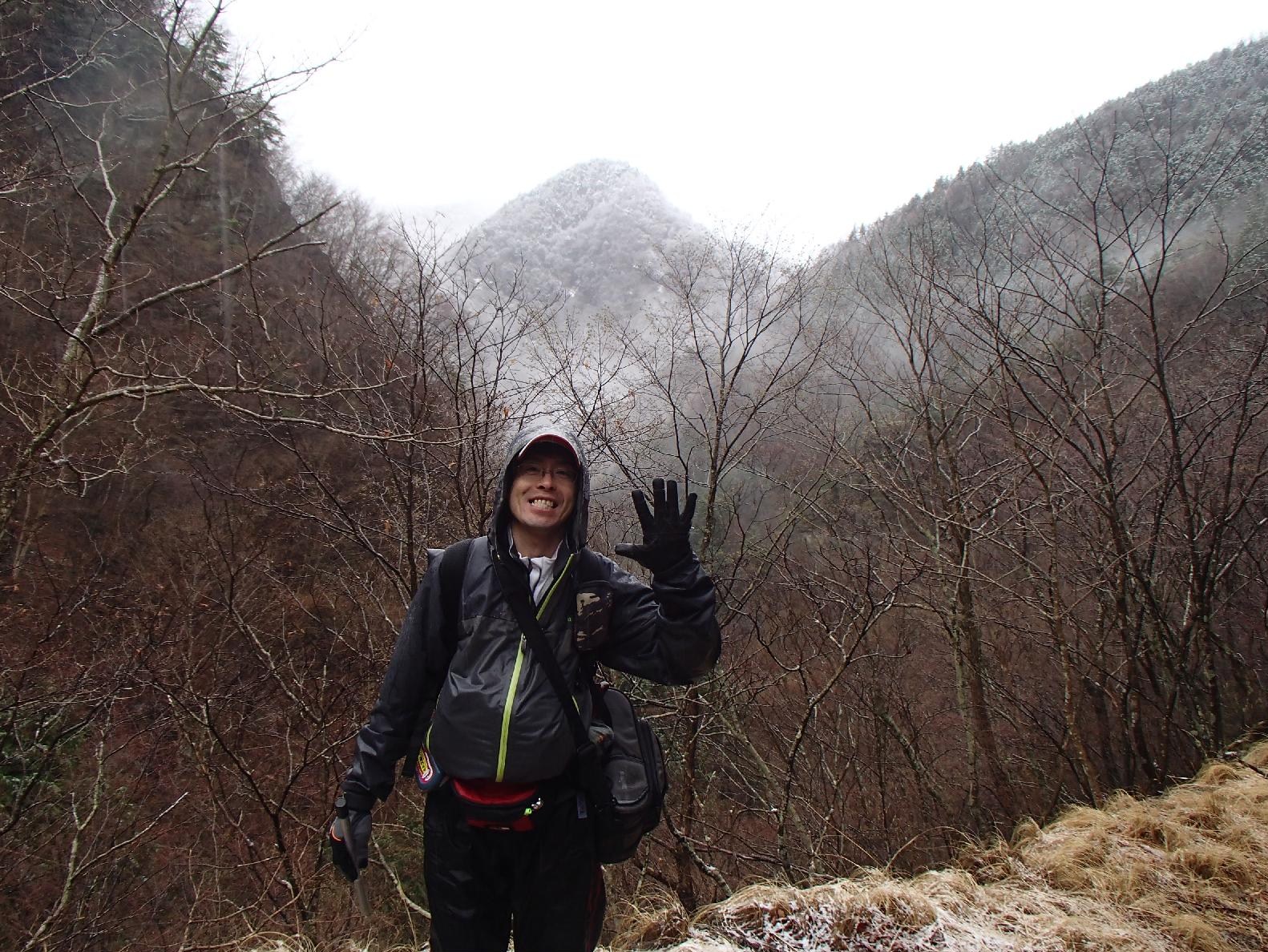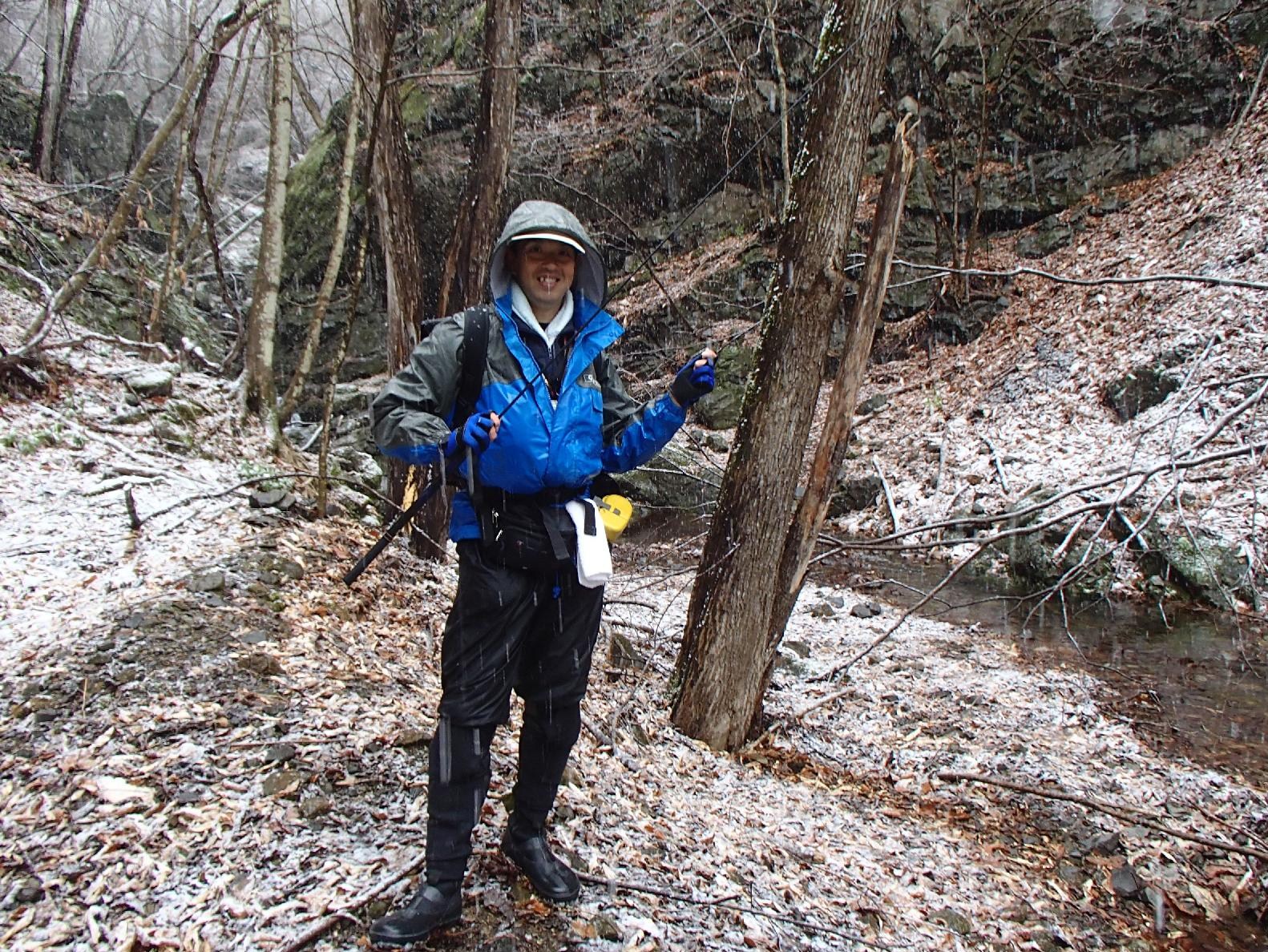 現地に着いたのが10時頃、雨の中準備を済ませ出発。山道を歩いていると途中で雪になってしまった。