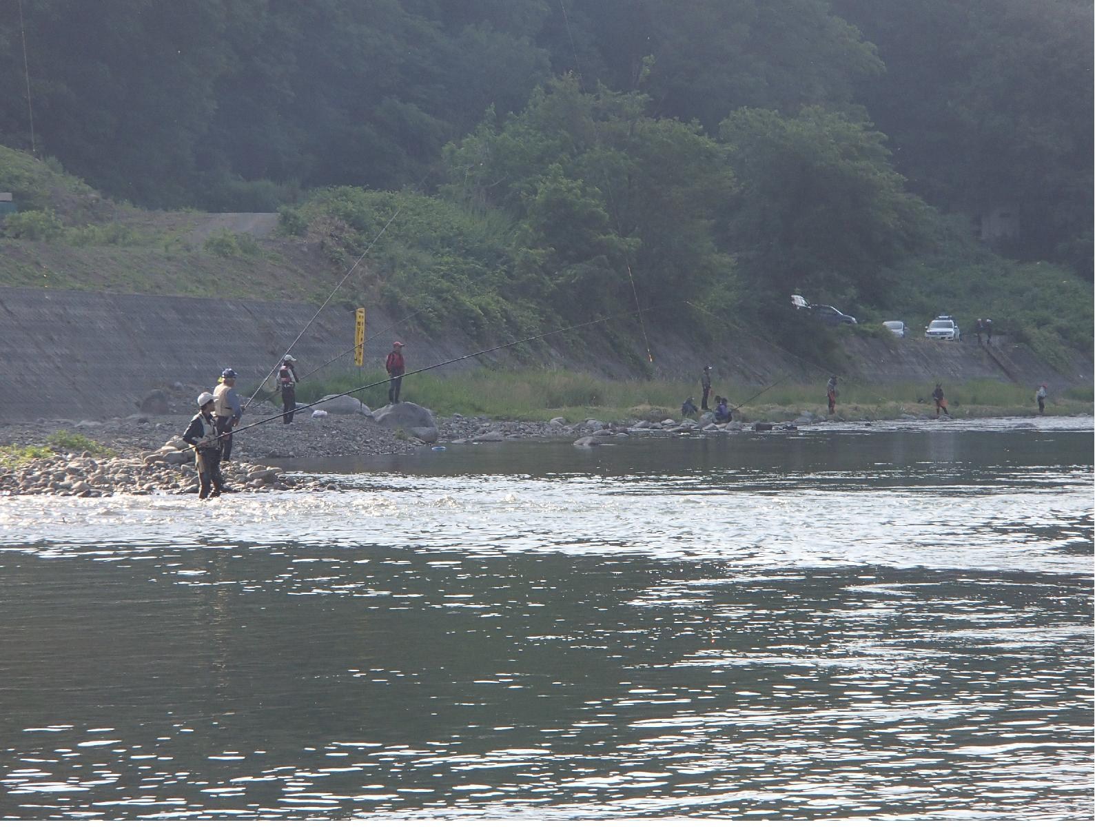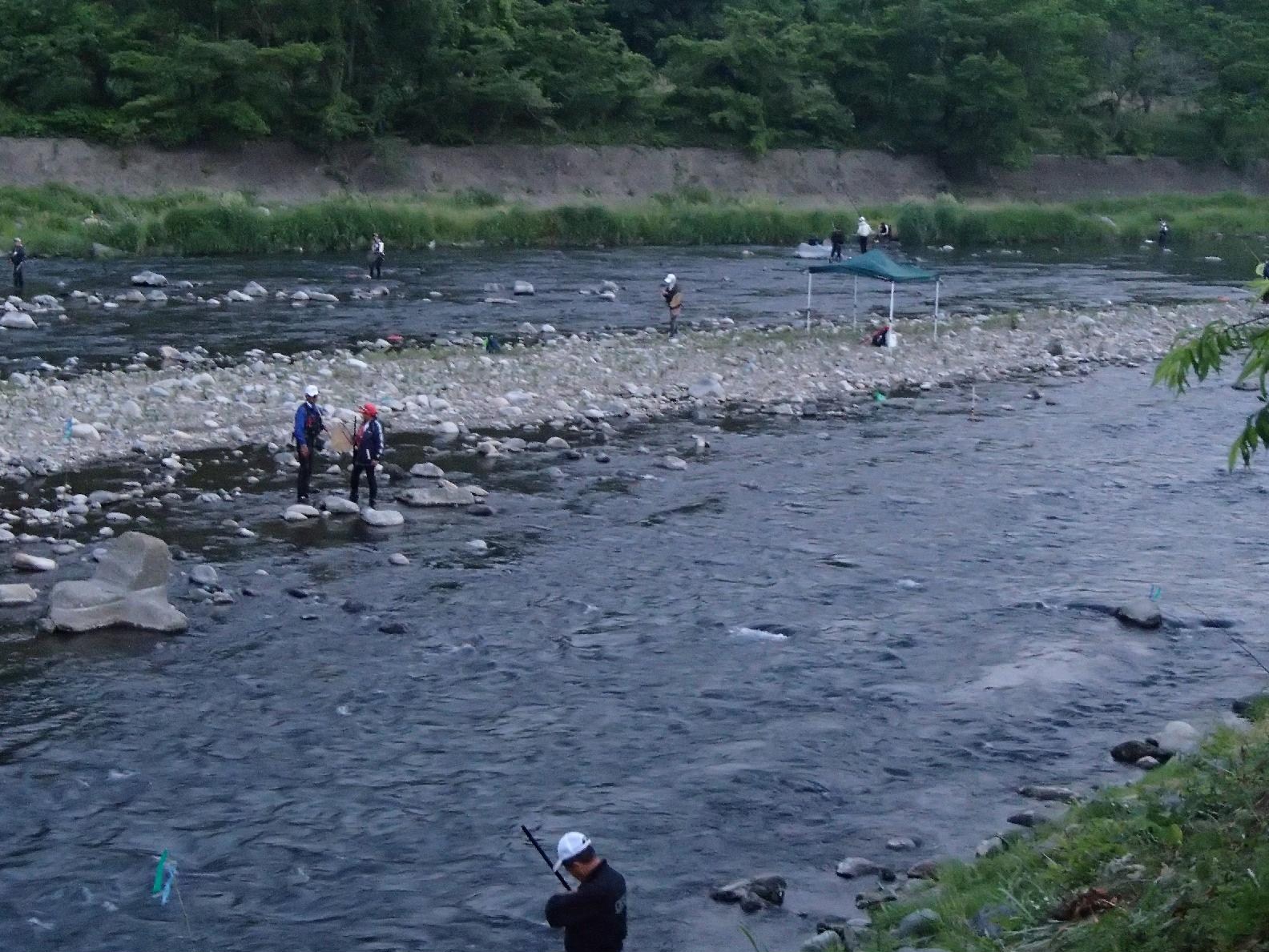 駐車場から川を見てみると、すでに良いところは、ほとんど場所取りを