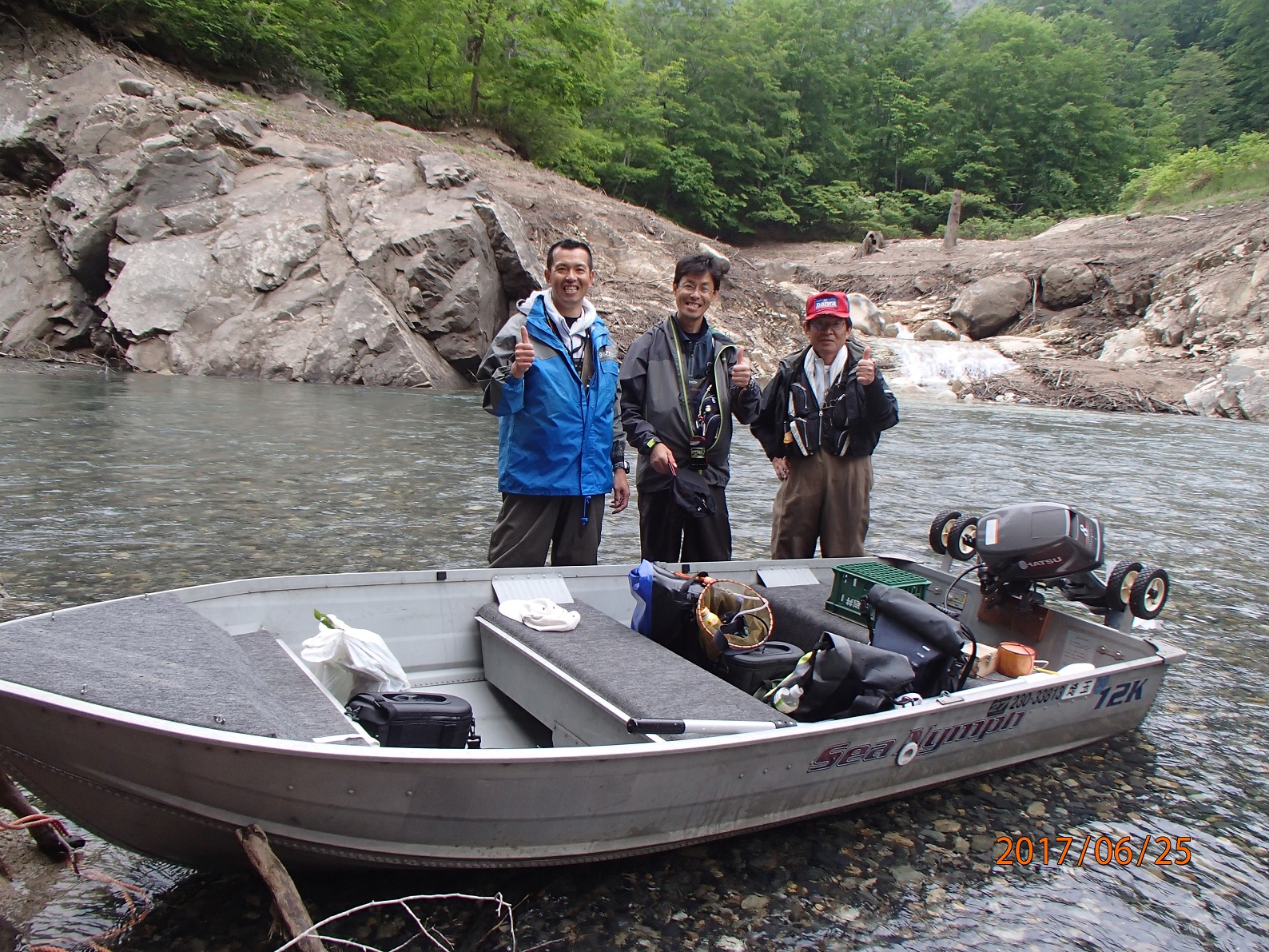 雨の中ボートを下し出発するころに雨は止んでくれたのでエンジン全開で本流に向かった。