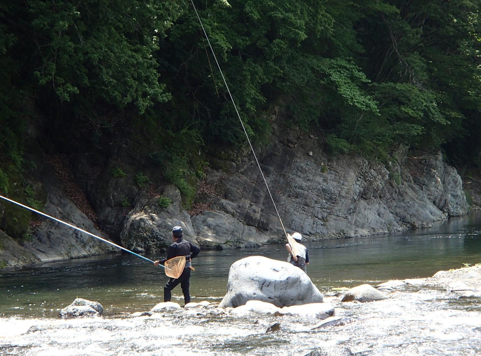 オトリ屋さんで良さそうな場所を聞いて川に入った。釣りを始めるとすぐに当たり