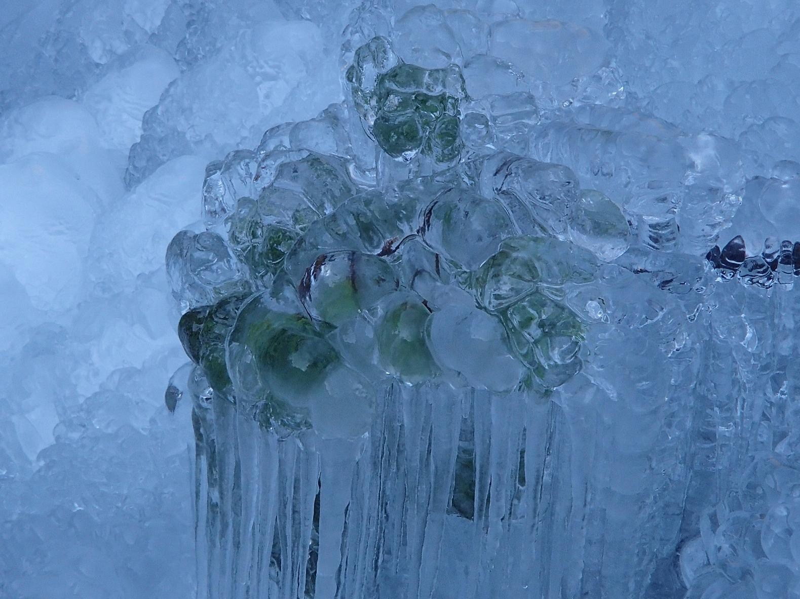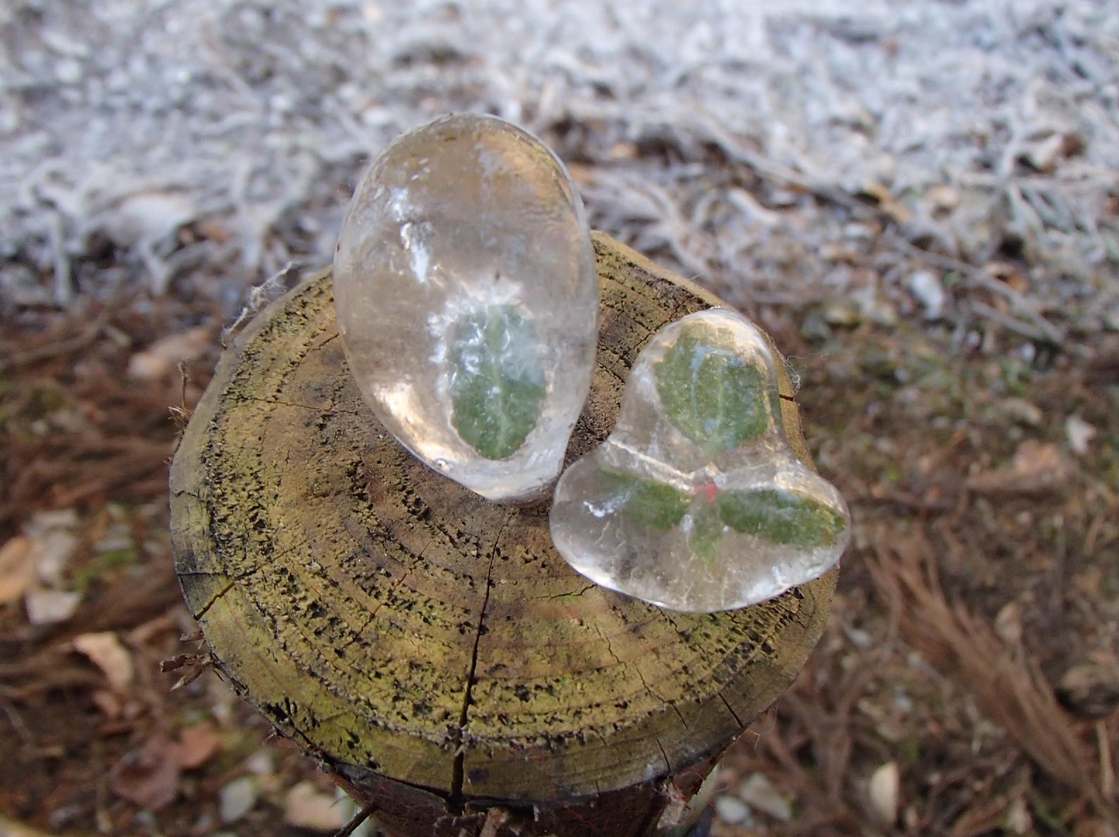 氷の中に青い葉っぱが!!